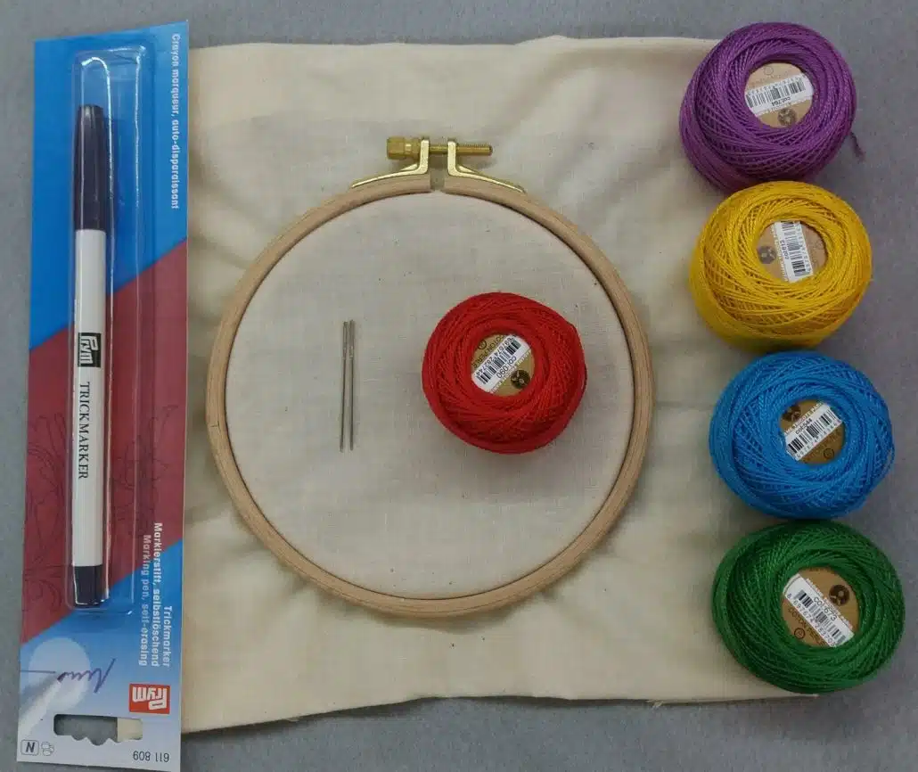 - 5 חוטי רקמה (אדום, כחול, צהוב, סגול, ירוק)