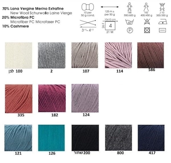 הרכב: 70% צמר מרינו, 10% קשמיר, 20% מיקרופיבר