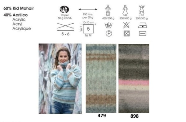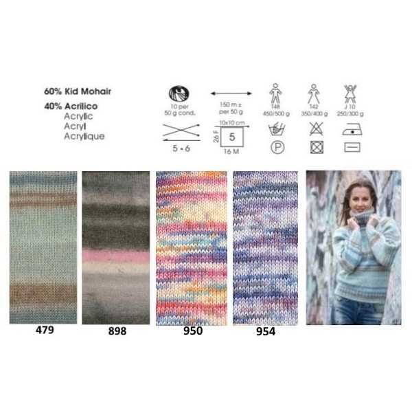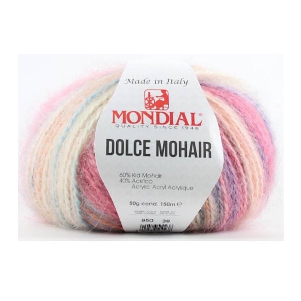 הרכב:60% קיד מוהר, 40% אקרילן משקל: 50 גרם מסרגה: 5-10 אורך: 150 מטר תוצרת: MONDIAL איטליה