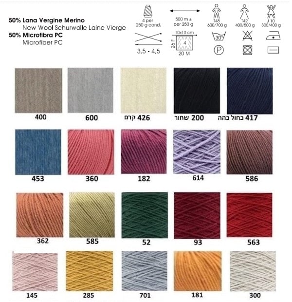 הרכב: 50% צמר מרינו, 50% מקרופיבר